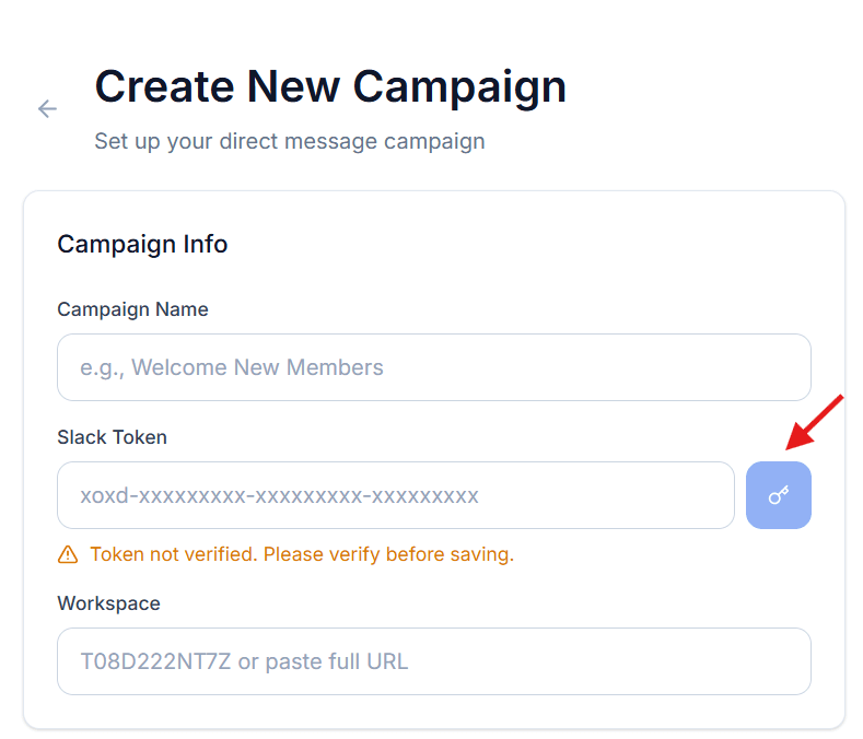 - Campaign Info: where you name your campaign, connect + verify your Slack workspace, and add workspace ID.