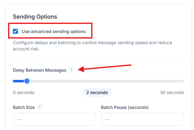 The Sending Options section controls how PenguinDMs delivers your messages, making the process feel more natural and human-like.