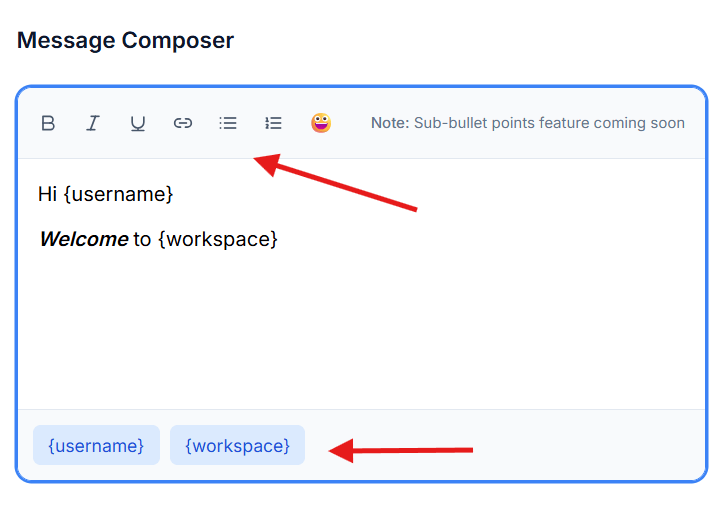 Inside the Message Composer, you’ll see a clean editor that lets you write your message in the main text box. You can also use basic formatting options at the top, like bold (B), italic (I), underline (U), add links, bullets or numbered lists, and even emojis 😄.