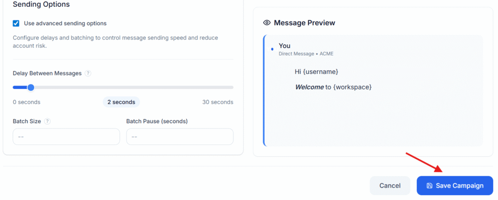 This delay adds a short pause after each message is sent, mimicking real human behavior and helping you stay under Slack’s radar.