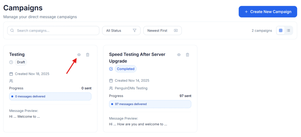 PenguinDMs will automatically redirect you back to the dashboard, where you’ll see your new campaign listed, along with its name, status, and action buttons (such as View & Delete).