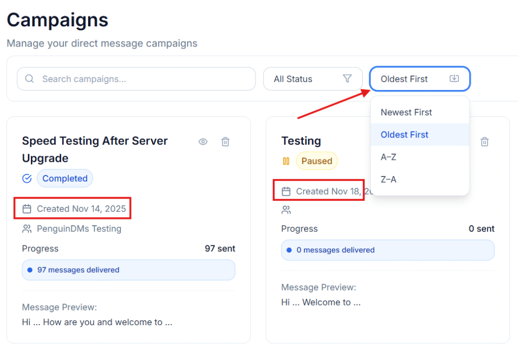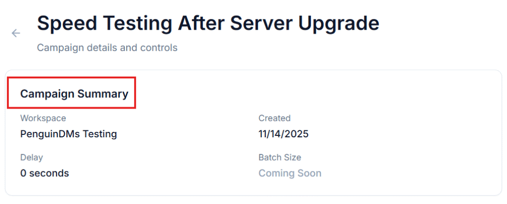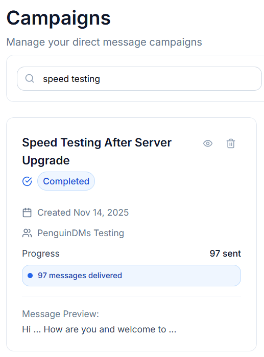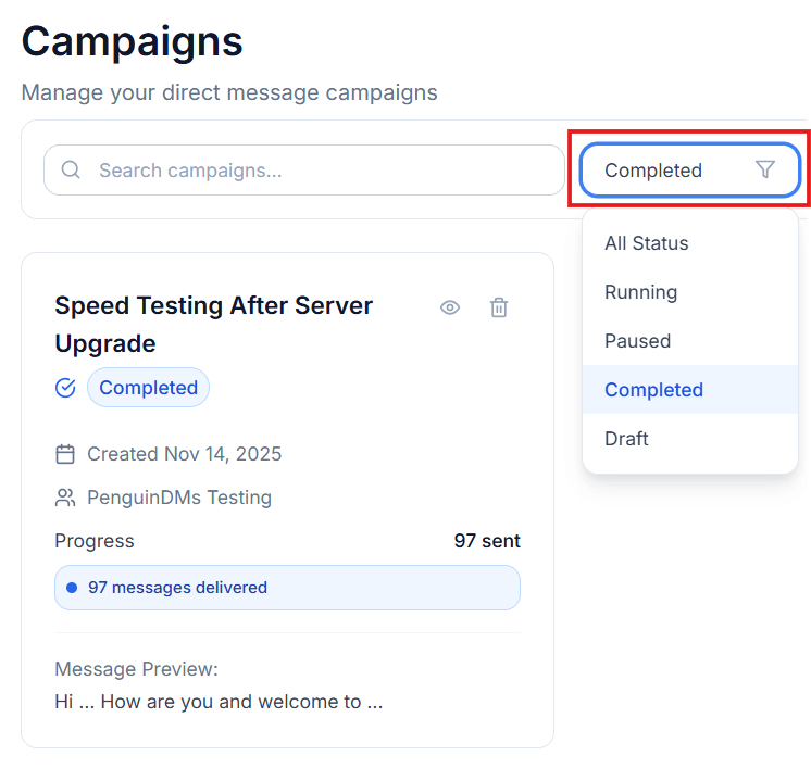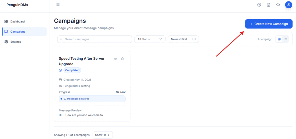 Once you’ve created a campaign, you can view and manage it anytime from the Campaigns page in your PenguinDMs dashboard.