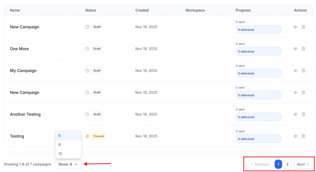 If you have many campaigns, use the pagination controls at the bottom to move between pages. You can also adjust how many campaigns are shown per page (e.g., 6, 9, 12).
