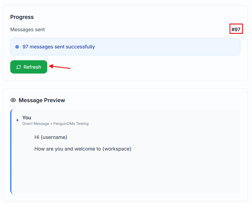 - Manual refresh for updates: The progress bar doesn’t update in real time. Click the Refresh button in the Progress section to see the latest message count.